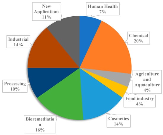 The cosmetic industry has been booming for the past few decades with approximately EUR 400 billion trade worldwide. Europe is the leading cosmetic market with a EUR 72 billion business, followed by the USA (~EUR 38 billion) and Japan (~EUR 30 billion). France has a substantial cosmetic market with nearly EUR 25 billion trade with roughly EUR 8 billion trade surplus [108]. The cosmetic industry is always hunting for new constituents for economic and social purposes. Bio-based materials have significant demand in the cosmetic industry, and the marine algal source has been considered extensively in cosmetics product development [109]. Seaweeds are the apparent option to consider in the cosmetic industry, as they contain various biomolecules, named phycocosmetics [108]. The brown seaweed Macrocystis pyrifera belongs to the laminariaceae family, which contains hyaluronic acid. Hyaluronic acid is the prominent constituent of the extracellular matrix and hence used as a treatment aid for burn victims since 1968 [110]. In many other cases, plastic surgeons use hyaluronic acid for treating volume loss and face wrinkles [108]. Fucoxanthin and Astaxanthin are major biomolecules constituted in the brown seaweeds. These biomolecules have excellent antioxidant properties, and therefore, have applications as an anti-aging ingredient in the cosmetic industry [111]. Micosporine-like amino acids (MAAs), such as shinorine and usujirene, are found in most seaweed algae. These molecules are responsible for absorbing most of the UV radiation between 310–360 nm and hence protect the seaweed algae. These MAAs have been exploited on an industrial scale for their application in sunscreen lotion [112]. Many brands such as Daniel Jouvance (LA Gacilly, France), Science & Mer (Paris, France), Phytomer (Brittany, France), Algotherm (Brittany, France), and Gelyma (Marseille, France) are working on commercializing the phycocosmetics, and many others are exploiting the future possibilities.