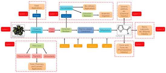 In 2007, the Biorefinery International Energy Agency (BIEA) identified different tasks that need to be achieved in order to develop a low-carbon sustainable economy. Task 42 aimed to implement sustainable biorefineries with a zero-waste value chain and the production of both bio-based food and non-food-based value chains [115]. The biomass from terrestrial origins is still the predominant feedstock; however, aquatic biomass is considered for the biorefinery approach in recent years. A seaweed biorefinery process could provide an essential boost to the seaweed market, thereby closing the loops in the circular economy. With additional economic value given to seaweed processing, several technologies have increased along with interest in this field, as reported by Laurens et al., 2017 [116]. Since seaweed is still an expensive feedstock (~USD 50–80/ton), the biorefinery approach allows full use of available biomass, including high-value applications, giving more socio-economic and environmental benefits. Figure 4 depicts the potential biorefinery approaches in seaweed processing through different systems. System 1 illustrates the traditional methpd of utilizing seaweed for the production of furfural. System 1 is the most discussed pathway in the literature, wherein seaweed is processed via physical and thermochemical technologies to extract the complex carbohydrate content (such as xylose, alginate, levulinate, etc.), thereby converting it into furfural. This system’s implementation is mostly at an early stage of development and at pilot scale in some cases. Furfural is a starting material for various products and a key intermediate in many bio-based value chains. Furfural derived from bio-based sources can be converted to solvents and chemicals used in the polymer and pharmaceutical industry, as projected in Systems 5, 6, and 7.