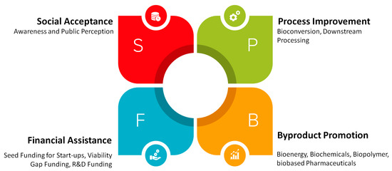 It is understood that seaweed has a great potential to go beyond its application as food and support the transition to a bio-based economy. However, specific shortfalls in knowledge have been identified based on the listed scenarios. It is unknown from the available literature how seaweed can mitigate climate change’s ongoing problems and support the concept of a circular economy. The available literature does not discuss viable business models for seaweed apart from its application as food. The social aspects are still missing from the available documents, which play a significant role in product establishment. Producing seaweed-based products at a laboratory scale and comparing them with already established benchmarks will not elucidate the barriers to commercialization. Therefore, a clear path forward is needed to consider the aspects which would lead to the commercialization of financially viable seaweed-based bioproducts. Based on the present understanding, we have summarized the “PBFS” approach, which is essential while considering seaweed-based products’ feasibility. The PBFS based product feasibility approach is presented in Figure 5 below. This approach considers four significant aspects of commercialization, including process development (P), by-product promotion (B), financial assistance (F), and social acceptance (S).