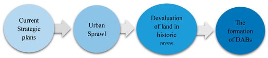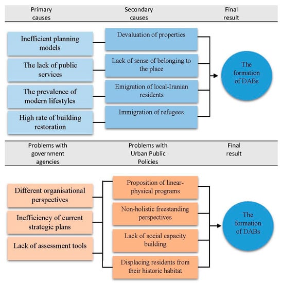 The current Comprehensive Planning paradigm, as proposed by the relevant agencies, has failed to resolve the urban development dilemmas of Iranian cities because it largely emphasises the need for integrated planning [42]. Moreover, contemporary urban planning and management suffer from several defects, such as the lack of stakeholder participation, the existence of diverse agencies in the process of urban management, the lack of finance, and the poor implementation of projects and regulations [43,44]. Insufficient vehicular access, a lack of car parking space and a lack of infrastructure have altogether transformed historic cities into problematic districts. The existence of organic geometry, the narrow dimensions of passageways, the lack of infrastructures necessary for modern urban life and the lack of visual integrity between new constructions and old ones have also altogether forced many local residents to leave the historic areas, which then amplifies the formation of DABs.