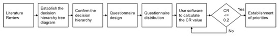 AHP is a decision-making method widely used by researchers and decision makers. AHP has three steps: modelling the problem as a hierarchy, evaluating the hierarchy and establishing priorities using a 9 to 1 to 9 scale [18,19,71,72]. The overall process of AHP is shown in Figure 2 below.