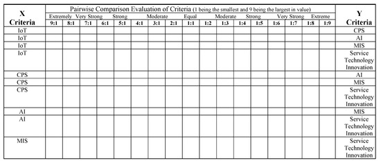 The questionnaire is designed in accordance with the five main criteria and their respective sub-criteria (3 each; 15 total). To minimize misunderstanding of the questions’ meaning, the questionnaire is provided bilingually in English and respondents’ native language (Traditional Chinese). After collecting basic information from interviewers, the main body of the questionnaire contains hierarchical comparison questions in pairwise, where the available answers are in a 9:1 to 1:9 scale in accordance with AHP methodologies [68,69,70,71,72]. Respondents are requested to check one box in each row to indicate his/her pairwise comparison judgement. Figure 3 below shows the sample matrix of the major criteria level where interviewees are required to check one box for each row.