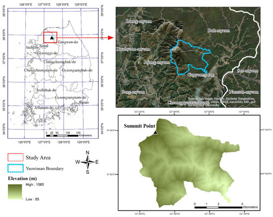Yeoninsan (1068 m) is a well-known provincial park in Gyeoggi-do, located on the backside of Seoul. The main administrative body is the Gyeonggi-do Provincial Office, as a local government, and the area of the region is 3732 ha (Figure 1). The forest is located across the boundaries of Seungan-ri of Gapyeong-eup, Mahil-ri of Jojong-myeon, and Baekdun-ri of Buk-myeon, as it embraces the Yongchu Valley, a popular tourist site. The forest is the natural habitat of a variety of alpine plants and wildflowers, as well as oak and nut pine communities, as a result of the rich soil and high annual precipitation [54]. The local residents are engaged in managing ecological programs and hands-on programs, while various joint projects to invite tourists are ongoing. The rationale for selecting this region as the study area is the presumption that—rather than a top-down approach whereby the central government controls the management—a bottom-up approach, where the resources under the administration of the local government are used, would allow for the more efficient design of the initial model of the local forest PESs.