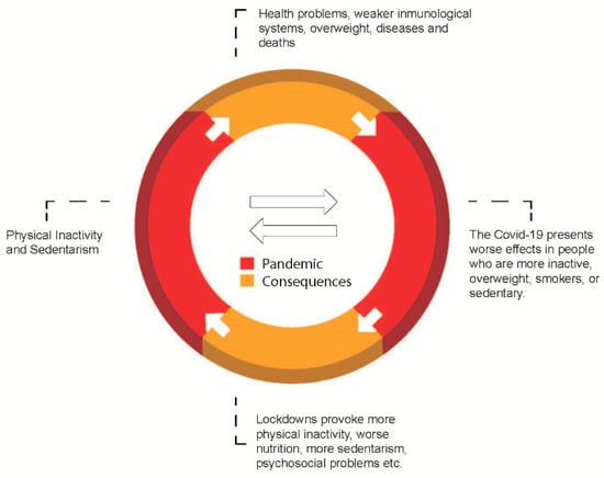 On 11 March 2020, the World Health Organisation (WHO) declared the coronavirus COVID-19 pandemic [1]. This global pandemic coincides with the one declared by the same institution in 2012 as a pandemic due to physical inactivity and a sedentary lifestyle, the latter being of a very different nature from that of COVID-19. The Lancet Journal even published a series of investigations to help fight this global pandemic of physical inactivity since it is the fourth leading cause of death worldwide [2]. The most worrying aspect is that both pandemics have influences on each other: Physical inactivity affects the immune system, and therefore one would be more exposed to COVID-19, and the confinement caused by COVID-19 causes an increase in sedentary lifestyles and decreases physical activity (Figure 1).