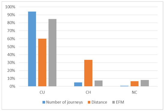 Distribution of number of journeys, distance, and EFM according to journey type.