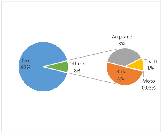 The total emission corresponding to each respondent was calculated by considering the emission factor of the mode of transport utilised, which is the amount of CO2 (kg) that a given mode of transport emits into the atmosphere per kilometre travelled. In the case of car travel, the number of occupants was also considered. The emission factors considered were: 0.20, 0.10, 0.07, and 0.05 kg of CO2/km for cars, depending on the presence of one, two, three, or four car occupants, respectively; 0.06 for motorcycle travelling; 0.03 for buses and trains; and 0.11 for airplanes. Non-emitting transport modes (e.g., on bicycle or on foot) had an emission factor of 0 [4,13].