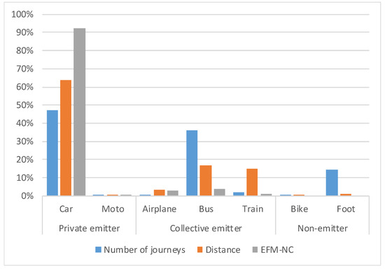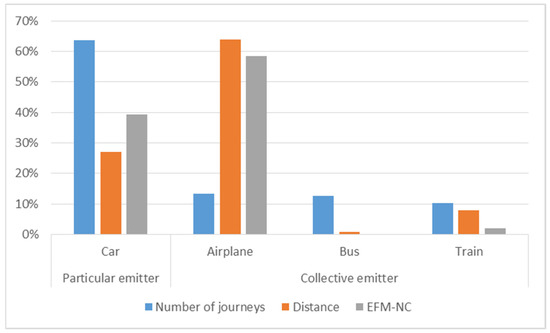 Figure 9 shows that car travel is the most frequently used transport mode in NC journeys (64%). It generates 39% of the EFM-NC, with 27% of the total distance covered by NC journeys. Airplane travel is only used for 13% of NC journeys, but it generates 58% of the EFM-NC with 64% of the total distance covered by NC journeys. Bus travel is used for 13% of NC journeys, generating less than 1% of the EFM-NC with 1% of the total distance covered by NC journeys. Finally, the train is used for 10% of NC journeys, generating 2% of EFM-NC with 8% of the total distance covered by NC journeys.