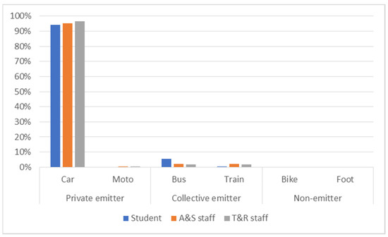 A&S staff display similar EFM pc values to students. Nevertheless, EFM pc values for T&R staff are greater because their place of residence is typically more distant from the campuses and their CU journeys are more frequently performed by car.