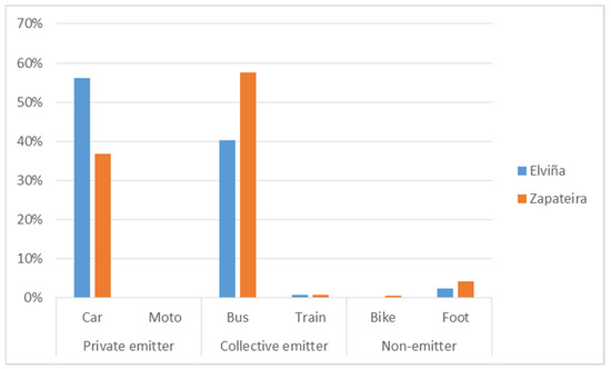 CU journeys number according to transport mode for the Elviña and Zapateira campuses.