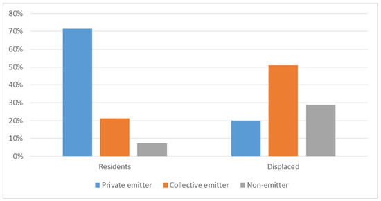 Distribution of the CU journeys according to transport-mode type, for residents and displaced persons.