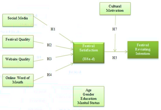 As depicted in Figure 1, the theoretical research model is built on many relationships. Social media marketing, festival quality, website quality, and e-word of mouth influences information with full moderated mediation on cultural motivation and tourists’ satisfaction through festival revisiting intention. The control variables include age, gender, marital status, education background, and nationality, which a have crucial impact on the relationships between the variables mentioned in the study.