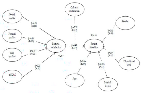 Relevant literature in tourism revealed that online destination marketing on festival revisiting intention can either have full or partial mediation with festival satisfaction. This may have direct or indirect effects on both the local and international tourists who have intentions of visiting the diaspora festival in the future. To evaluate the mediating role of festival satisfaction between dimensions of festival quality and tourists’ revisiting intention toward the Badagary Diaspora Festival in Nigeria, mediation conditions of Baron and Kenny [] were employed in the present study. The laid down conditions were: (a) predictor must have a significant effect on the result of the variable; (b) it is essential that the predictor must have a significant effect on the mediator; (c) the outcome of the variable must be significantly affected by the mediator; (d) lastly, after introducing the mediating variable between the predictor and outcome variable, the direct impact of predictor on outcome becomes insignificant (full mediation). Nevertheless, if the direct effect is lessened, then it is measured as partial mediation. Additionally, in order to observe the aforementioned standards, only those dimensions of festival satisfaction were considered in the mediation model, which appeared to have a significant impact on diaspora festival revisiting intentions based on the cultural motivation of the festival destination []. Thus, we hypothesized the following: