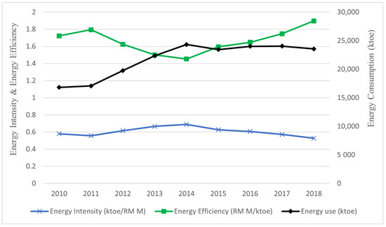 Malaysia is a developing country with an average economic growth rate of 5%; during the last decade, it has attempted to become an industrialized country. The transport sector was responsible for 4% of the country’s real gross domestic products (GDP) and labor employment of 10% in 2018 [11]. Under such contributions, this sector is the largest energy consumer and second-largest contributor to total CO2 emissions in Malaysia. It consumed over 36% of the total final energy demand in 2018 [11] and produced 60 million tons of CO2 emissions in 2017 [12]. The trends in energy consumption, energy efficiency, and energy intensity in Malaysian transportation are presented in Figure 1. It shows that while the energy efficiency trend was increasing (during 2010–2011), and thereafter was decreasing until 2014, the country has experienced increases in energy efficiency after 2014. This reveals that the production of one unit of GDP in the transport sector requires an increasing amount of energy. This result can also be found from the trends of energy use and energy intensity in Figure 1.