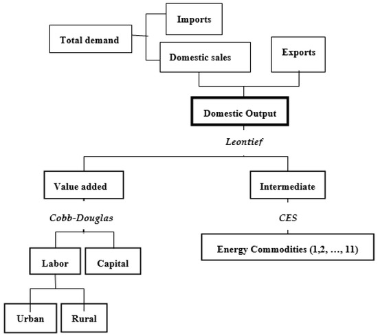 where Xi denotes the output in sector i; αiX reveals the shift parameter of the production function; SCFDi,f is demand for factor f by sector i; and βi,f reveals the elasticities in the production function.