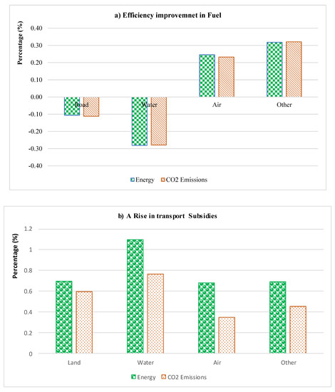Improving fuel efficiency decreases energy demand in the land and water transport subsectors, resulting in lower CO2 emissions (Figure 3). It should be noted that the decline in energy demand and CO2 emissions in water transport occurred mainly due to the decline in its production. However, this policy increases energy consumption in the air and other transport subsectors, which in turn increases CO2 emissions in these sectors. This reflects the existence of the rebound effect in the air and other transport subsectors. This result is consistent with the finding of the study conducted by Martínez-Moya et al. [46], which argued that improving energy efficiency at ports decreases CO2 emissions. Blesl et al. [47] also showed that energy efficiency through the use of biofuels and methanol is able to reduce CO2 emissions in the transport sector. On the other hand, an increase in government subsidies to the transport subsectors increases energy use and consequently CO2 emissions in all transport subsectors. This is in line with the results of Danish et al. [48], who stated that investment in transport in Pakistan is not environmentally friendly. Danish and Baloch [49] showed that land infrastructure boosts economic growth and impedes environmental quality. This shows that the energy efficiency policy is more effective in reducing energy consumption and CO2 emissions than the subsidy support.