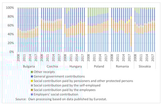 The revenues of the budgets of public social insurance systems were obtained from two main sources, namely, the mandatory social contributions and the government transfers (Figure 1). In the period 2008–2018, income from social contributions paid by employers, employees, self-employed persons, and other insured persons represented over 70% of total income in the Czech Republic and a share between 50% and 70% of total income in other CEE countries. The highest share of income from social contributions in the period 2000–2018 was held by social contributions paid by employers (up to 50% of income), except for Romania in 2018, where the share of income obtained from social contributions paid by employees exceeded 60% of the total budget revenues.