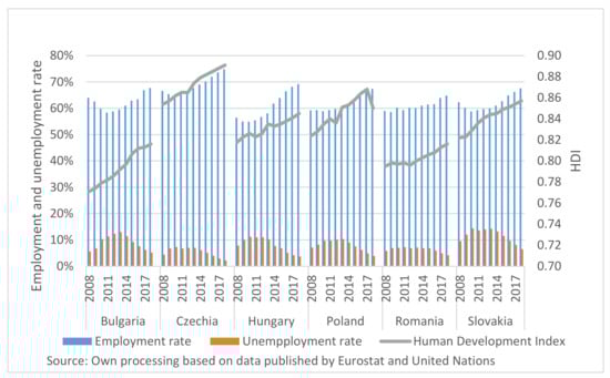 The employment rate represents the percentage of people who perform a paid activity or who are temporarily on leave, in the total population, having the capacity to carry out professional activities. The unemployment rate shows the percentage of people aged between 15 and 74 who are not employed in the total workforce. The human development index measures the main characteristics of the population and their ability to ensure the development of a country. Between 2008 and 2018, the employment rate increased by 12.8% in Hungary, 8.2% in the Czech Republic and Poland, 5.8% in Romania, 5.3% in Slovakia, and 3.7% in Bulgaria (Figure 2). At the same time, the unemployment rate decreased by 4.1% in Hungary, 3.2% in Poland, 3% in Slovakia, 2.2% in the Czech Republic, 1.6% in Romania, and only 0.4% in Bulgaria. Regarding the HDI, the level of the index increased in all six European countries. The highest increase was registered in Bulgaria (+0.045), Czech Republic (+0.037), and Slovakia (+0.035), followed by Hungary (+2.7), Poland (+2.6), and Romania (+0.021).