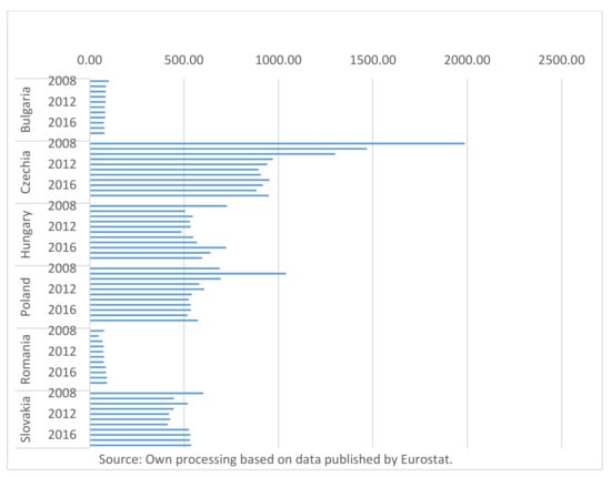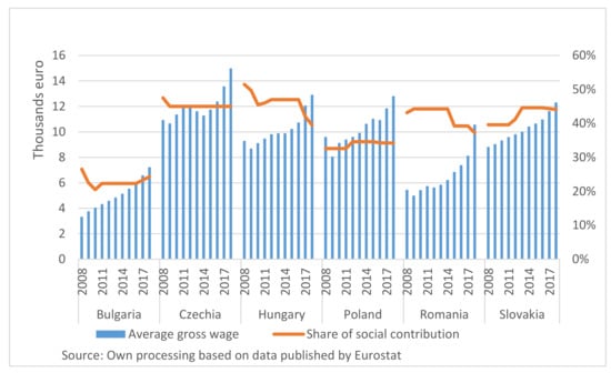 The average gross wage expresses the average annual level of remuneration and other payments received by an unmarried person without children, before withholding taxes, fees, and compulsory social contributions. In CEE countries, the level of the average wage increased in the period 2008–2018, the highest increase being registered in Bulgaria (+117%) and Romania (+94%), while in the other countries, the increase was between 34% and 40% (Figure 3). However, in monetary terms, the incomes achieved by Bulgarian and Romanian employees were lower, compared to those obtained by employees in the other CEE countries. Social contributions represent a mandatory pecuniary levy that individuals and/or legal entities pay from their income to the social insurance budget. The level of compulsory social contributions in all five European countries rose to over 35%.