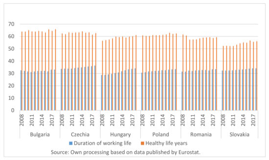 The duration of working life is defined as the number of years that a person is supposed to be active in the labor market, and healthy life expectancy shows the number of years that a person expects to live without major or severe health problems. The duration of working life of the population of the five CEE countries increased between 2008 and 2018 to values of over 30 years, the highest increase being 5.4 years in Hungary. In addition, healthy life expectancy increased to values between 53 and 65 years. However, in Romania, healthy life expectancy decreased by 2.1 years (Figure 4).