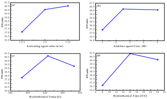 Mean of S/N ratios were calculated and plotted against four factors activating agent ratio (a), activating agent Conc. (b), hydrothermal temp. (c), and time (d) with three levels.