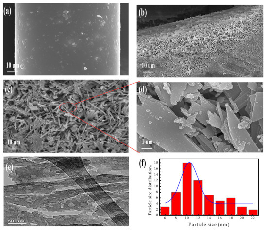 The surface morphology of glass fiber waste and as-prepared MZN was first characterized and compared by electronic microscopic images. Figure 2a shows the original glass fiber SEM image showed a coarse rod-like fiber pattern on a uniform surface. According to the SEM images of MZN in Figure 2b–d, the replacement material structure framework showed the growth of a needle-like cilium crystalline structure and presented many flake crystal phases with a multi-layered assembly. They intertwined with each other to form a porous structure.