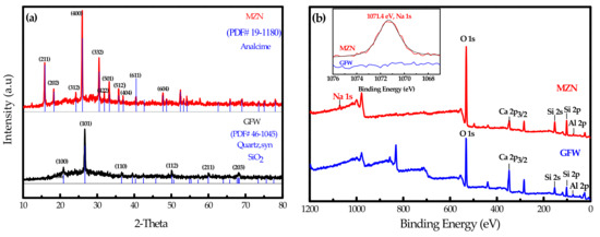 To further study the surface chemistry of the GFW and MZN, the XPS spectra of GFW and the activation treatment of MZN materials were determined (Figure 3b). Several XPS peaks shows the Al 2p, Si 2p, Si 2s, Ca 2p3/2, O 1s, and Na 1s at 75, 102, 153, 348, 532, and 1071 eV, respectively. As clearly illustrated in the Figure 3b inset, the addition of NaOH was followed by the hydrothermal treatment appearance. Therefore, the Na peaks at 1071 eV increased the oxygen intensity at O 1s peak in the MZN. This result is well in line with the result of analcime zeolite obtained by XRD analysis. When the original GFW reacted with NaOH during the activation of hydrothermal treatment, the quartz phase through the induced transformation to form the crystalline aluminosilicate framework, and the exposure of oxygen atoms would produce Si-OH or Si-O···Na+ groups [40]. Therefore, the quartz SiO2 in the GFW could be completely tailored as the analcime zeolite after the alkaline reaction.