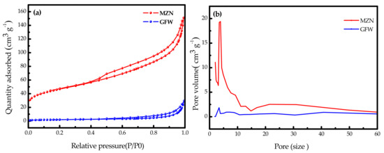 The specific surface area and pore texture of the original GFW and MZN were further examined. As shown in Figure 4a, the nitrogen adsorption–desorption isotherm of GFW showed a quantity of weakly adsorbed capacity following type IV isotherm with a hysteresis loop in the relative pressure range (P/P0) of 0.55–0.99. The specific surface area of the original GFW was 11.2 m2 g−1, which results obtained were close to the original superfine glass fiber [41]. In contrast to the original GFW materials, the MZN material also followed type IV physisorption behavior with a strongly H3 hysteresis loop intensity in the relative pressure (P/P0) range of 0.4–0.99. This was mainly contributed from the capillary condensation in mesoporous structure [42,43], which could benefit and provide a large surface area of the adsorption for dye macromolecules. Hence, the specific surface area increased from 11.2 m2 g−1 of the original GFW material to 166 m2 g−1 for MZN after the alkaline activation (Table S5, Supplementary data) higher than the report result of analcime zeolite [44]. Nasser et al. [45] fabricated the analcime phase zeolite of aluminum isopropoxide, using the hydrothermal method, by sodium hydroxide and aluminum sources. They found that the specific surface area was 20.2 m2 g−1. Abdelrahman et al. [46] also prepared an analcime/sodium aluminum silicate using hydrothermal by Si(IV) template mixture at 393 K for one day. They found that the specific surface area of the dried analcime/sodium aluminum silicate hydrate was 12.7 m2 g−1. In this study, a novel MZN material of the specific surface area was 8.2~13.0 times higher than those reported data. It is presumably attributed to the alkaline through breaking the Si-O and Al-O bond of quartz SiO2 structure into free Si-O tetrahedron to form analcime and the inter-connected pore size.