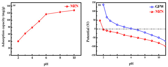 (a) Adsorption capacity of mesoporous MZN materials toward MB adsorption at different pH and (b) isoelectric point of GFW and MZN materials as a function of pH.