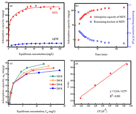 (a) Adsorption isotherms of MB dye adsorbed onto GFW and MZN in aqueous solutions and (b) adsorption kinetic of MB dye adsorbed onto MZN at pH 6.0. (c) Adsorption isotherms of MB dye adsorbed onto MZN at various temperatures, and (d) plot of lnKc vs. 1/T for MB adsorption onto MZN. The initial concentration of MB is 10–60 mg L−1, the adsorbent dosage is 1 g L−1, and the adsorption time is 60 min.