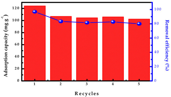 Five recycles of applications were applied to verify the stability and reusability of the MZN material, as exhibited in Figure 7. The adsorption–desorption experiments were conducted for five cycles through the repeated calcinate of the MZN [10]. Although the removal efficiency of MB onto MZN decreased from 97% to 80% (absorption capacity 124 to 102 m2 g−1) after the 1st use, the effectiveness was stable from 2nd to 5th use. Those possible causes could be the closure of pores due to the sintering effect as the calcination temperature is much higher than the hydrothermal temperature and the desorption of bottleneck effect [63]. Therefore, the adsorption capacity and removal efficiency of this mesoporous MZN were stable after the 1st use with good reusability. However, this MZN will be applied to treat other organic and inorganic pollutants in the future.