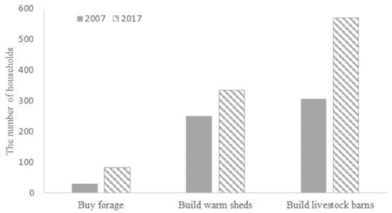 The number of households that buy forage, build warm sheds, and build livestock barns in 2007 and 2017.
