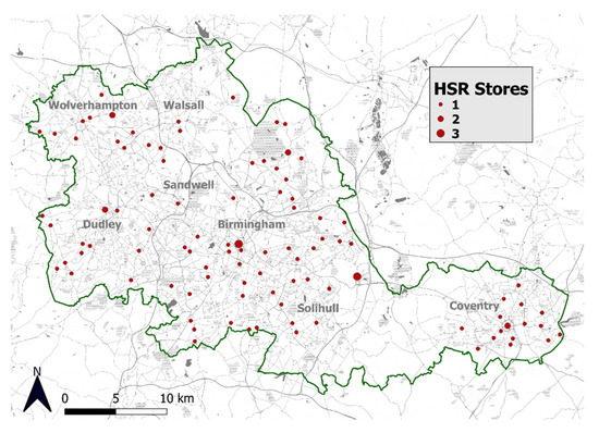 There were over 100 HSR stores located in the West Midlands metropolitan area. Stores could be broadly separated into four distinct store types, which provided diverse services and were also located in distinct retail areas, including small and large high streets, edge-of-town retail parks and major transport hubs. Whilst the data used for this study were limited to a single retailer, this diversity in both the services provided and the location of stores meant that this data could be used as a proxy for the retail opportunities that can be accessed by cardholders.