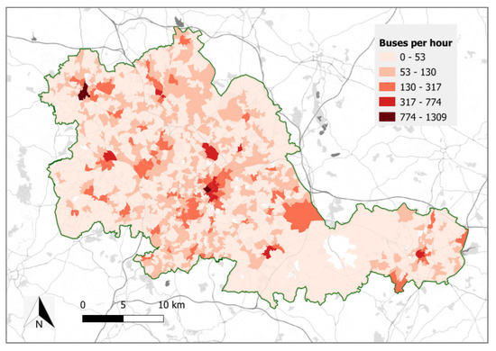 To calculate the average service provision in each LSOA, bus timetable data were used. The timetable data were filtered to contain only the journeys that were scheduled to arrive at each stop on a weekday and during off-peak hours, using the ‘Day of week’ and ‘Arrive’ variables. The data could then be grouped by the ‘NaPTAN code’ variable, and the number of buses scheduled to visit each stop were calculated. The average hourly service provision was then calculated as the mean number of buses that visit each stop per hour. These bus stops were then aggregated to LSOA, with the total number of buses that visit each LSOA per hour calculated, as shown in Figure 2.