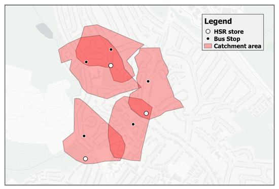Example catchment area analysis showing HSR stores, bus stops and catchment areas.