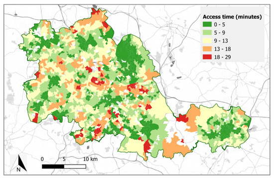 Additionally, this analysis could have been expanded to include more than one transfer between services. However, due to the computational cost associated with this, it was deemed unnecessary for the scope of this study. As this analysis focused on minimum travel times, transferring between two or more services whilst considering wait times at stops in many cases would not have resulted in shorter travel times. The aggregation of these travel times to LSOA levels would also have minimised the impact that any outliers had on the overall results of the regression models. The unavailability of data relating to other modes of transport may also have limited the accuracy of the estimated travel times, with some stores that have high bus travel times being easily accessible by metro or train services. The inclusion of these data in future analyses would undoubtedly improve the overall accuracy of the public transport travel time distributions shown in Figure 4.