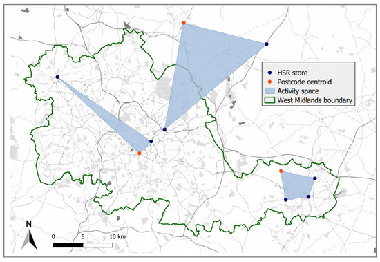 Three example activity spaces constructed as MCPs covering the centroid of the cardholders’ registered LSOA and the locations of their regularly visited HSR stores.