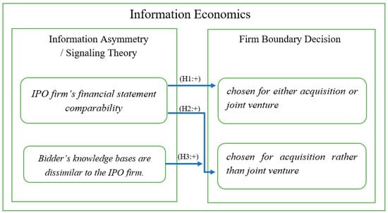Corporate strategy, based on the research rooted in resource-based views and transaction cost economics (TCE), typically explains the boundary decisions of firms with ex-post costs. TCE explains market failure with ex-post opportunism [1,2]. Recently, Sestu and Majocchi [3] explained the choice between wholly-owned subsidiaries and joint ventures from the perspective of transaction costs. Tseng [4] and van Rijnsoever et al. [5] explained acquisition versus alliance with a resource-based view. However, information economics applications in corporate strategy focus on ex-ante hazards to explain the boundary decisions of firms. This study focused on explaining the application of information economics in corporate investment strategies among joint ventures and acquisitions, using newly public firms as target firms. Regarding its application in corporate strategy, joint venture is a mechanism that alleviates adverse selection problems because ownership in joint ventures reduces the risk of overpayment [6,7]. Therefore, a joint venture represents an experimental basis for sequential investment transactions. On the contrary, Reuer and Ragozzino [8] suggest that sufficient information signals on target firms reduce ex-ante hazards, thus allowing bidders to acquire rather than enter joint ventures with firms or even avoid a deal altogether. Similarly, McCann et al. [9] suggest that a geographic co-location of similar firms fosters lower levels of information asymmetry between exchange partners, thus leading parties to employ acquisitions rather than alliances. Extrapolating from this previous literature, we hypothesized that signals of the post-initial public offering (IPO) firms’ financial statement comparability can affect the bidders’ choice between acquiring or agreeing to a joint venture with target firms.