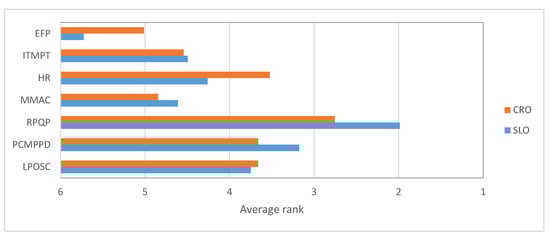 Spearman’s rank-order coefficient confirms a significant strong positive correlation (rS(7) = 0.883, p = 0.008) between the mean ranks of Croatian and Slovenian companies. Both Croatian and Slovenian companies evaluated RPQP as the most important driving parameter (Figure 1). However, its average rank was lower in Slovenia (1.98) than in Croatia (2.75). In Croatia, HR was the second most important driving parameter, while PCMPPD was second in Slovenia. Both countries assessed RPQP, LPPOSC, PCMPPD and HR as the four most important driving parameters.