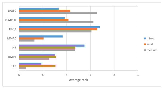 Spearman’s rank-order coefficient shows a fairly strong positive, though not significant, correlation (rS(7) = 0.714, p = 0.071) between the mean ranks of micro and small companies and between small and medium companies (rS(7) = 0.679, p = 0.094). The correlation between micro and medium companies is less strong (rS(7) = 0.464, p = 0.294). Micro and small companies evaluated RPQP as the most important driving parameter (Figure 2) and HR as the second most important. On the other hand, medium companies highlighted LPOSC as the most important driving parameter, followed by PCMPPD and RPQP.