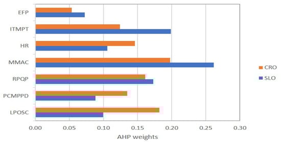 Both Croatian and Slovenian experts evaluated MMAC as the most important driving parameter (Figure 4). However, while Croatian experts evaluated LPOSC as the second most important driving parameter, Slovenian experts put ITMPT on the second place. RPQP and HR were ranked third and fourth by Croatian and Slovenian experts.