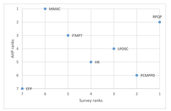 The rankings of driving parameters between experts (AHP) and companies (survey) differ significantly. Figure 5 shows that there is a very poor correlation between survey and AHP rankings (rS(7) = 0.143, p = 0.760).