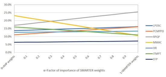 To convert the survey ranking into weights of importance of driving parameters SMARTER (Equation (4)) was used and the results are presented in Table 2. The final weights were calculated as linear combination of survey and AHP weights using Equation (5). Figure 6 presents final weights as a function of factor of importance α.