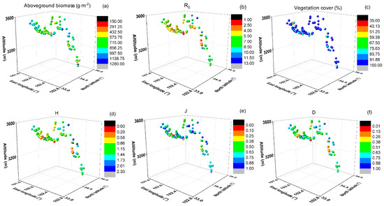Three-dimensional distribution patterns of vegetation biomass, cover, and species diversity indices: (a) Plant aboveground biomass; (b) Patrick index (R0); (c) Vegetation cover; (d) Shannon index (H); (e) Pielou index (J); (f) Simpson index (D).