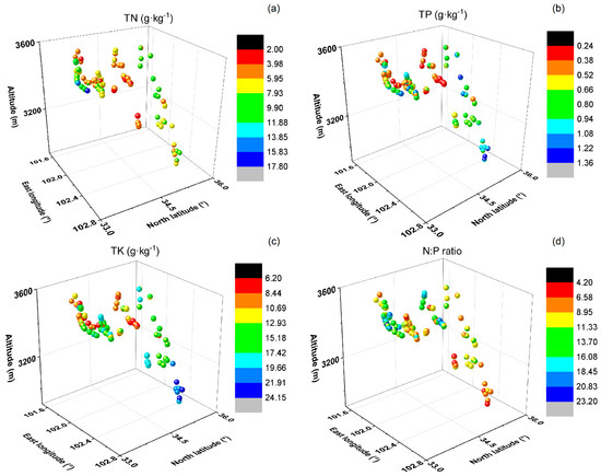 Three-dimensional distribution patterns of soil nutrient concentrations and N:P ratios: (a) soil total nitrogen (TN); (b) soil total phosphorus (TP); (c) soil total potassium (TK); (d) soil N:P ratio (N:P).