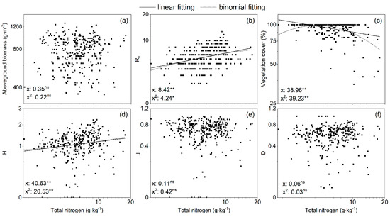 Plant aboveground biomass, species diversity in relation to soil total nitrogen (TN) (log scale): (a) plant aboveground biomass; (b) Patrick index (R0); (c) vegetation cover; (d) Shannon index (H); (e) Pielou index (J); (f) Simpson index (D). Relationships were modeled with second-order polynomial regression; F values and significance levels are indicated within each graph for the linear (x) and binomial (x2) terms. Regression lines are shown if significant. Aboveground biomass and cover were log-transformed, species diversity index R0, H, J, and D were square root-transformed for the regression calculations. “ns”: the regression equation was not significantly correlated at p < 0.05, “*”: the regression equation was significantly correlated at p < 0.05, “**”: the regression equation was significantly correlated at p < 0.01.