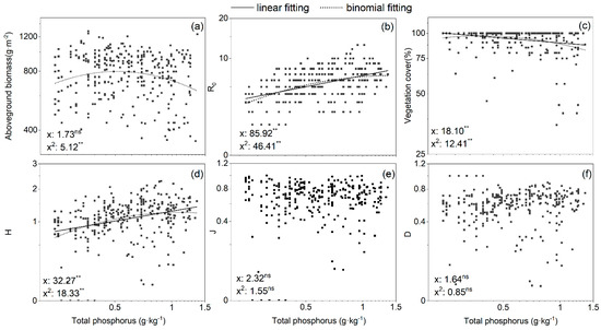 Plant aboveground biomass, species diversity in relation to soil total phosphorus (TP) (log scale): (a) plant aboveground biomass; (b) Patrick index (R0); (c) vegetation cover; (d) Shannon index (H); (e) Pielou index (J); (f) Simpson index (D). Relationships were modeled with second-order polynomial regression; F values and significance levels are indicated within each graph for the linear (x) and binomial (x2) terms. Regression lines are shown if significant. Aboveground biomass and cover were log-transformed, species diversity index R0, H, J, and D were square root-transformed for the regression calculations. “ns”: the regression equation was not significantly correlated at p < 0.05, “**”: the regression equation was significantly correlated at p < 0.01.