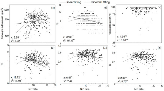 Plant aboveground biomass, species diversity in relation to the soil N:P ratio (log scale). (a) Plant aboveground biomass; (b) Patrick index (R0); (c) vegetation cover; (d) Shannon index (H); (e) Pielou index (J); (f) Simpson index (D). Relationships were modeled with second-order polynomial regression; F values and significance levels are indicated within each graph for the linear (x) and binomial (x2) terms. Regression lines are shown if significant. Aboveground biomass and cover were log-transformed, species diversity index R0, H, J and D were square root-transformed for the regression calculations. “ns”: the regression equation was not significantly correlated at p < 0.05, “*”: the regression equation was significantly correlated at p < 0.05, “**”: the regression equation was significantly correlated at p < 0.01.