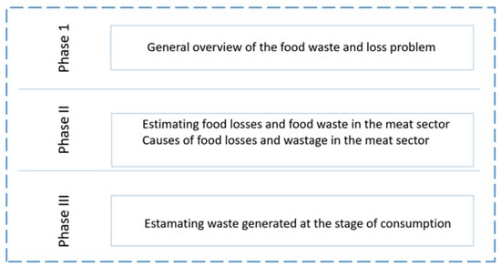 A systematic and comprehensive article retrieval strategy that provided a general impression of the food loss and waste with particular emphasis on the meat sector. The Web of Science was searched up to March 2021 using search terms for English publications. Many relevant articles were obtained by combing the keywords (food loss, food waste, meat sector) in a more detailed retrieval strategy. Moreover, a manual search of the references of relevant articles has been done.The methodology framework consists of three distinct phases (Figure 1). In the first phase, a literature review was performed to discuss the problem of of the food loss and waste on a European and global scale. In the second phase, food loss and waste in the meat sector was estimated, the causes were recognized. In the third phase, waste generated at the stage of consumption was estimated taking into account their causes.