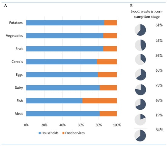 Food waste in the EU for several food group in the consumption stage for 2011. (A)—share of households and food services in food losses at the consumption stage; (B)—share of food waste at the consumption stage in relation to total food waste.