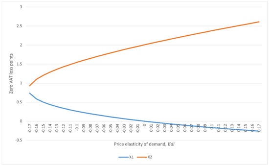 In order to determine all possible zero VAT loss points, we calculated all possible roots of Equation (18) for values of between −10 and 10 with step 0.01 and for the case of , which was observed on the Czech market in 2018 (Figure 3). As can be concluded from these results, zero VAT effect points for have non-linear dependence on price elasticity of demand. The values of zero VAT effect points for are negative, and thus do not make economic sense. Lower zero VAT effect point () takes negative values at point and higher, thus only the higher root () makes economic sense. The form of the line depends on both and .